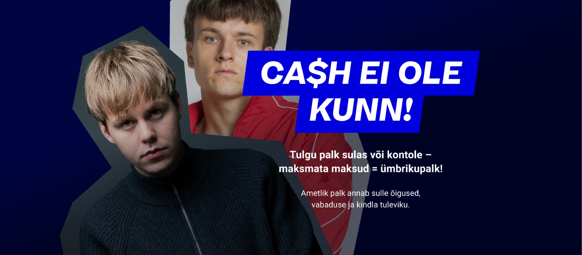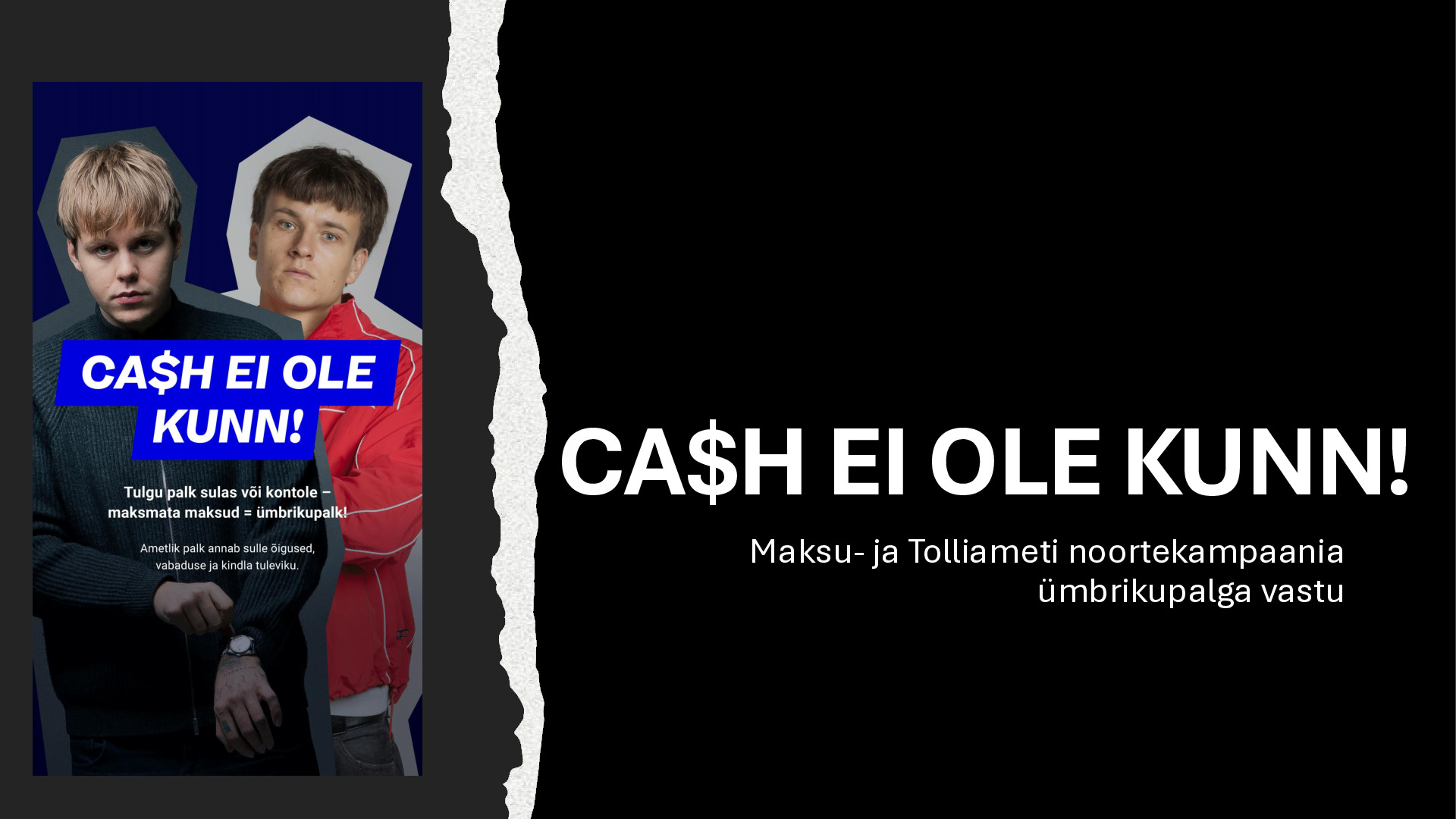 Kampaania "CA$H EI OLE KUNN" tõstis 15–24-aastaste eesti keelt kõnelevate noorte maksuteadlikkust ja võitles ümbrikupalga vastu. Kasutades noorte seas populaarseid muusikuid Sämi ja Karl Killingut ning sotsiaalmeedia-pärast videokõne formaati, jõudsime 97% sihtrühmast. Tulemuseks on märkimisväärne kasv noortemaksukuulekuses: 63% noortest tunneks end nüüd maksudest kõrvale hoides halvasti (kasv +9)