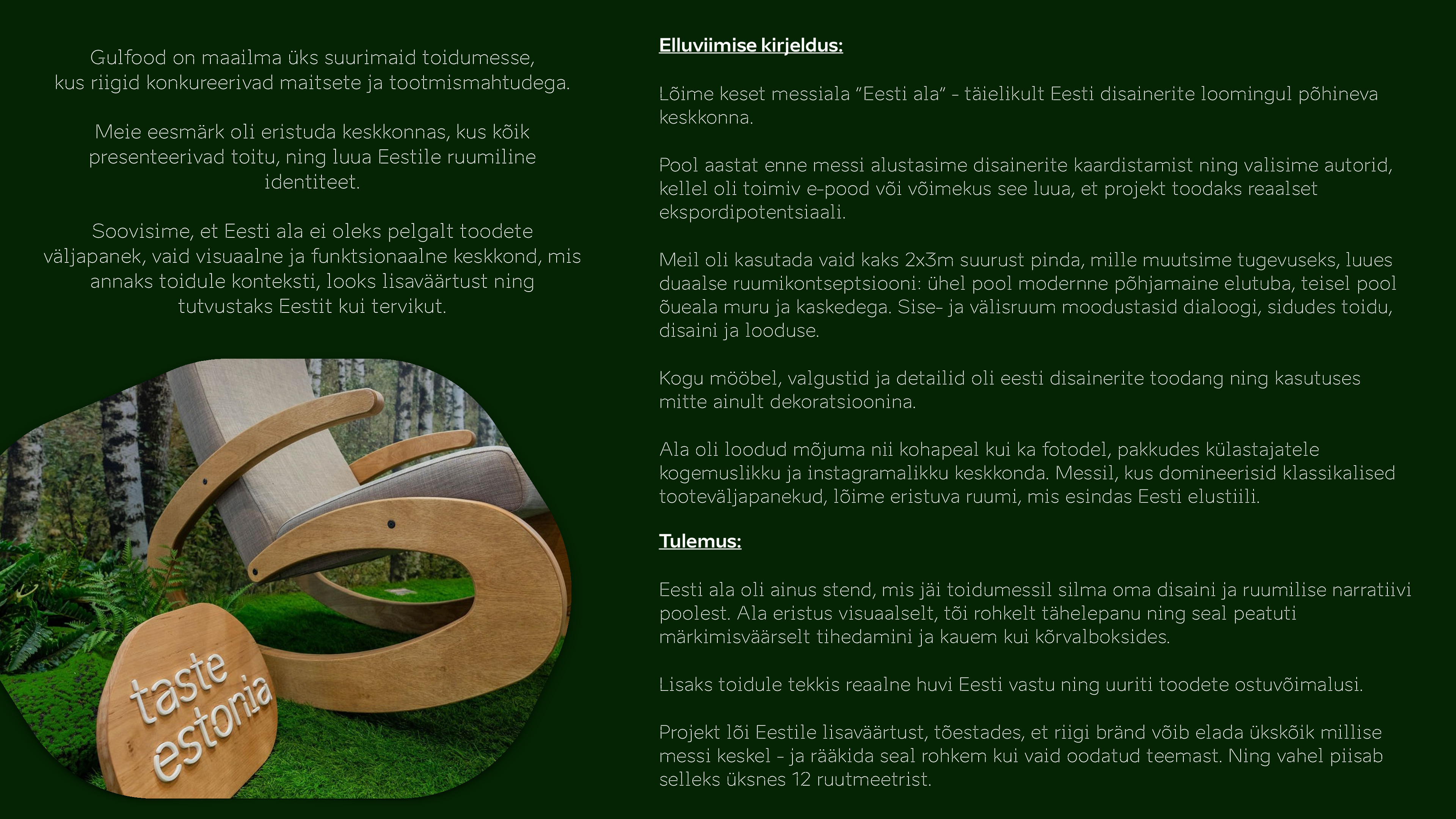 Projekt tõestas, et Eesti suudab ka kõige ootamatumas kontekstis jutustada suurema loo kui vaid oma toodetest – rääkida visuaalselt nii elustiilist, väärtustest kui identiteedist ning luua ruum, mis paneb riigi päriselt elama.