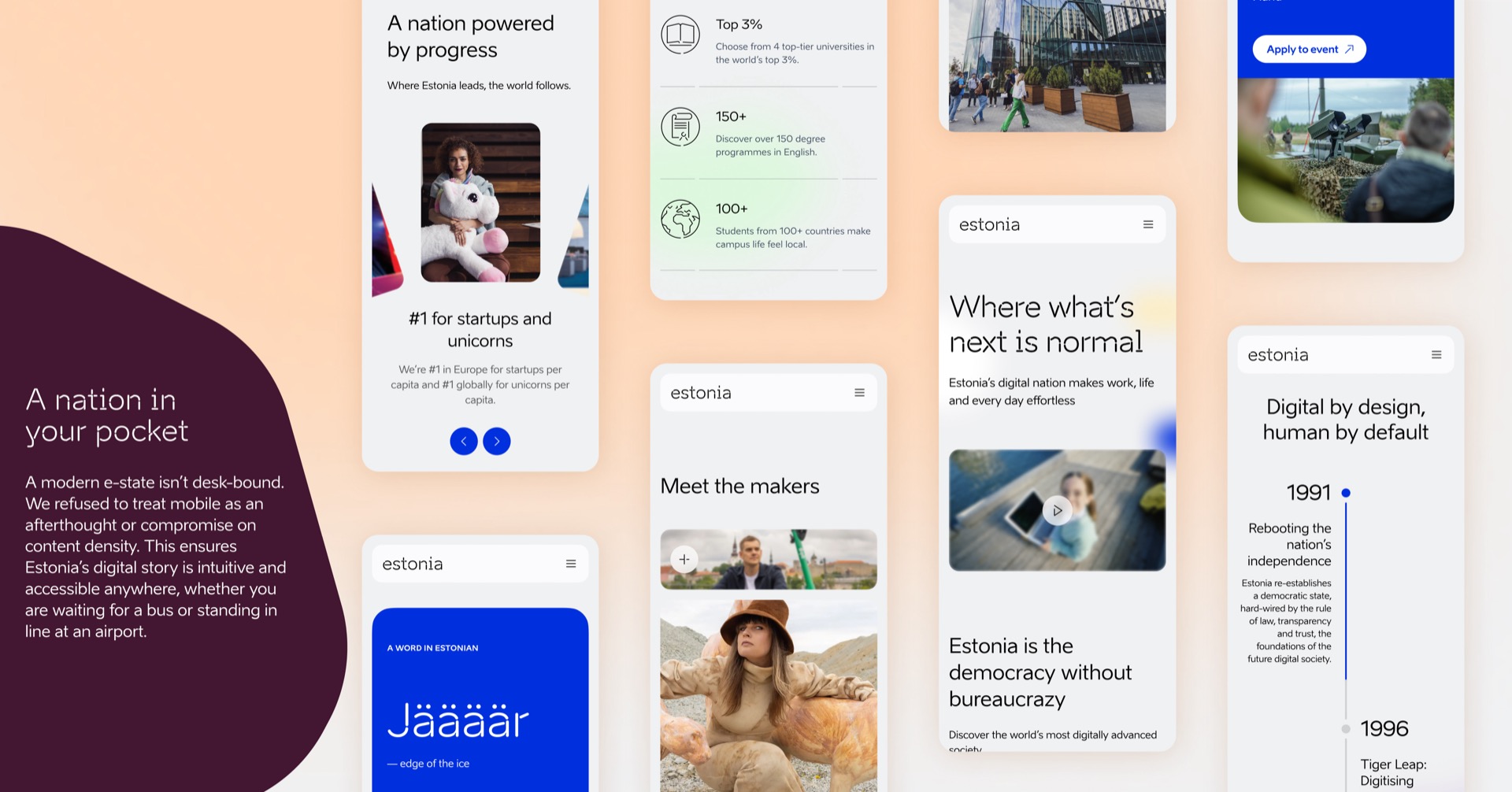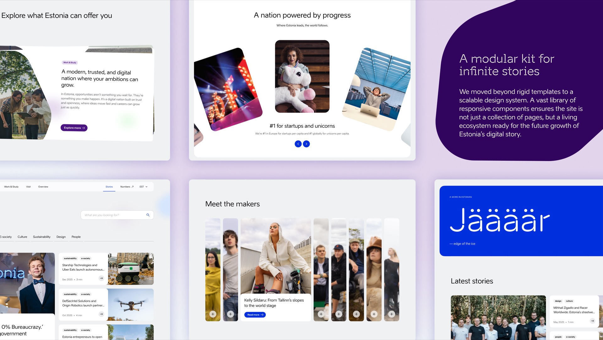 Eesti uus esindusveeb seob raba vaikuse ja agiilse digiriigi tervikuks. Lammutasime keerulise infoarhitektuuri ja ehitasime selle üles uue disainisüsteemi toel. Tulemuseks on selge, kaasaegne ja usaldusväärne veebileht, mis seab riigibrändide digitaalses kuvamises uue rahvusvahelise kvaliteedistandardi. Uus süsteem on mõeldud kasvama ning kandma meie riigi identiteeti ka tulevastes veebides.