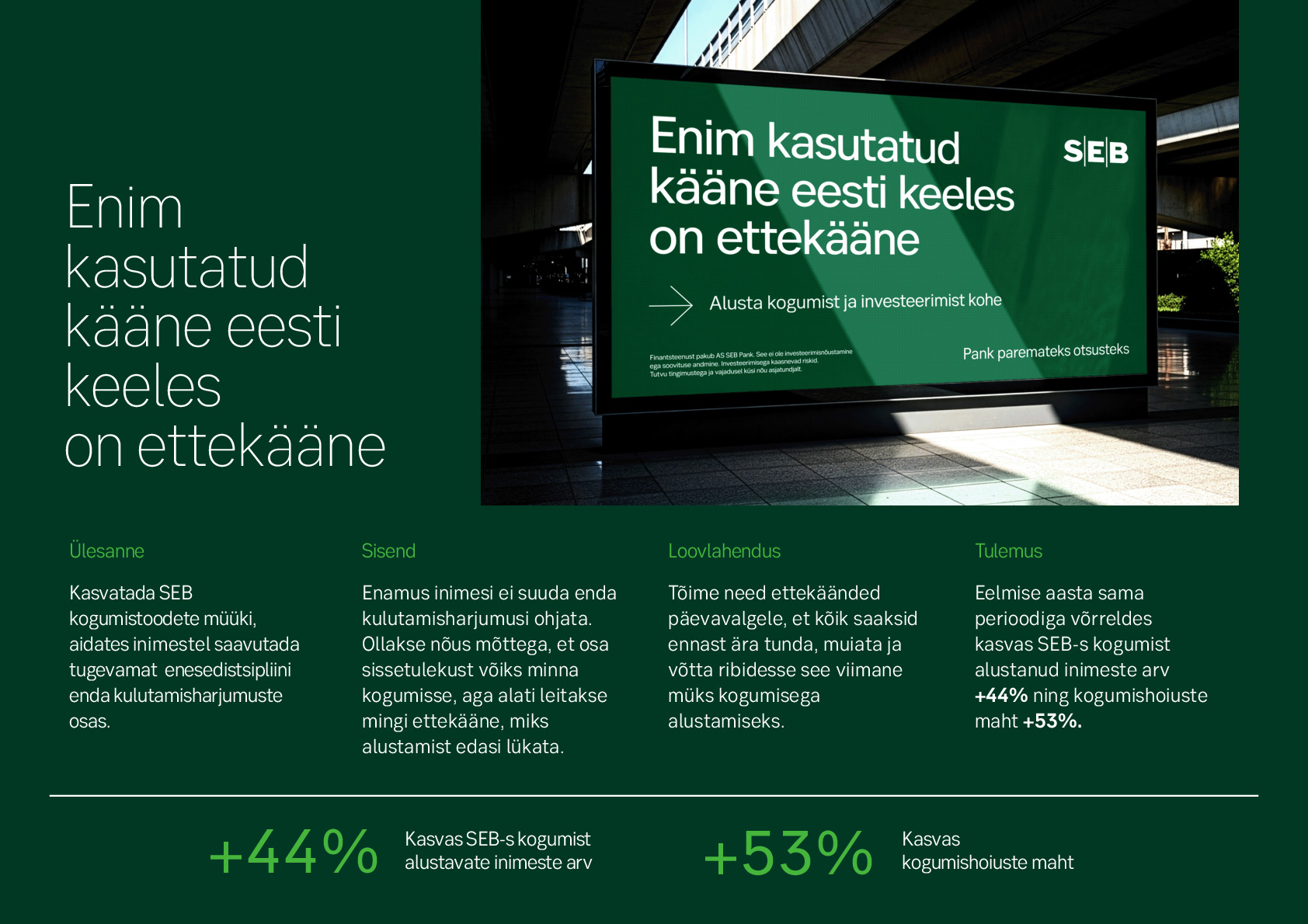 Suurim takistus raha kogumisel pole rahanappus, vaid ettekäänded. SEB Ettekäänete allee tõi esile levinuimad vabandused, millega kogumist edasi lükatakse, esitades need järjest nii, nagu me seda ise sageli teeme. Postrite rida muutus peegliks: inimesed tundsid end ära, ettekäänded kaotasid jõu ja esimese sammu tegemine muutus lihtsamaks. Nii aitas SEB teha parema otsuse kohe, mitte "pärast".