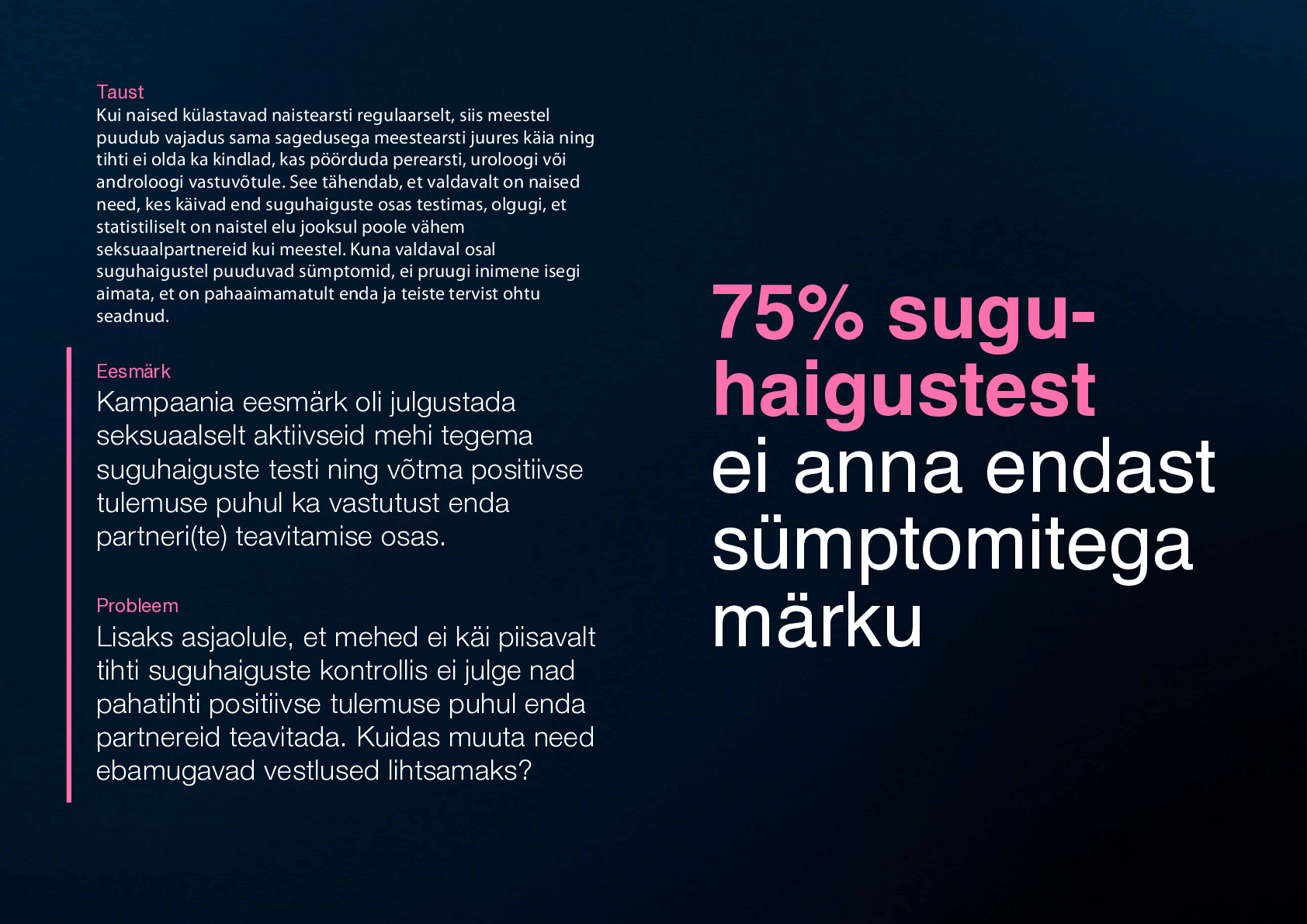 75% suguhaigustest kulgevad sümptomiteta, mis tähendab, et inimesed levitavad neid edasi pahatihti lihtsalt...teadmatusest. Kuna üks põhilisi suguhaiguste testimise perioode on pärast jõulu- ja aastavahetuspidusid, sobib natukene kõhe sosistamine täpselt pimedatesse talveõhtutesse. Lisaks on see hea meeldetuletus uut aastat puhta lehena alustamiseks!