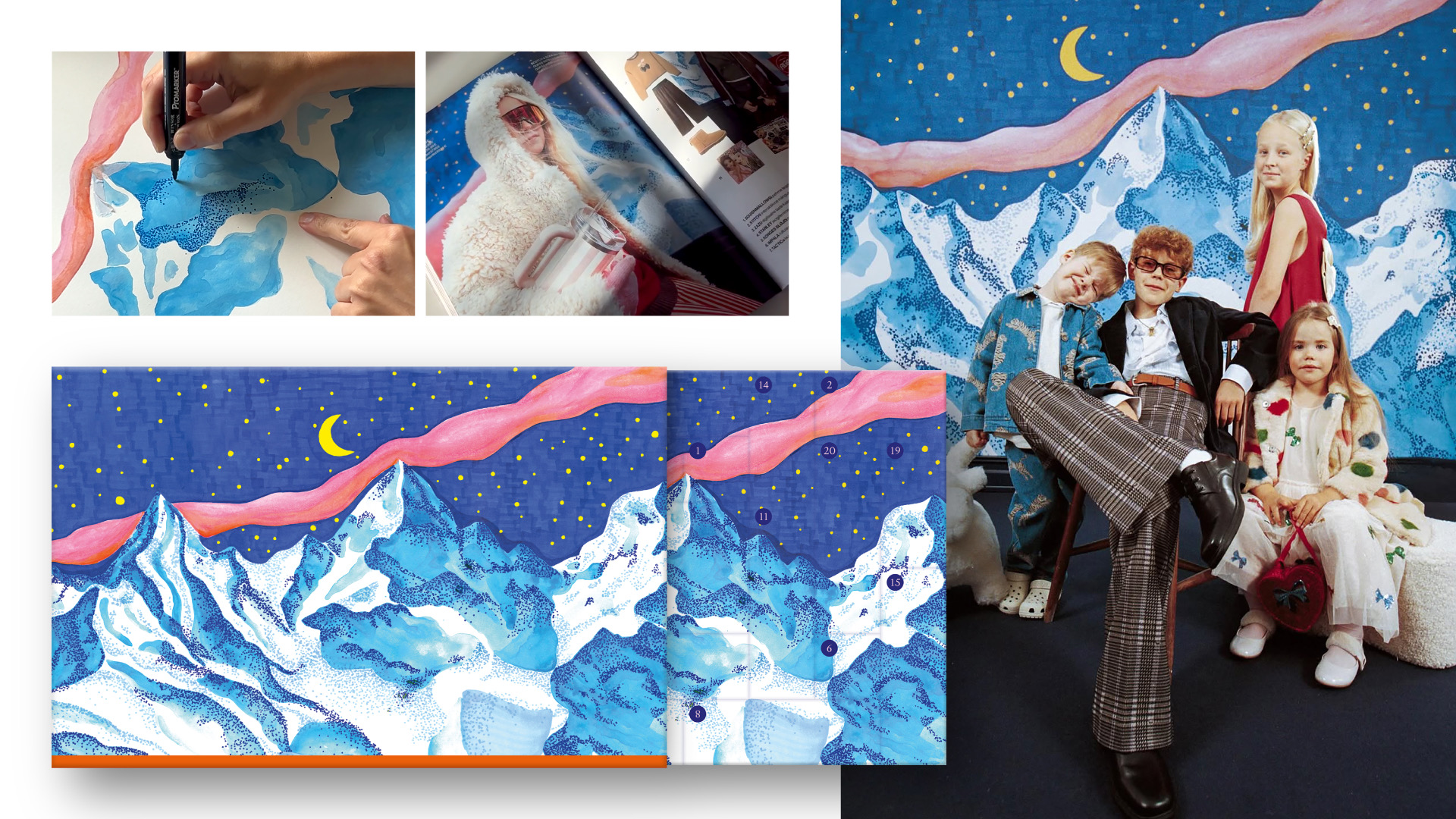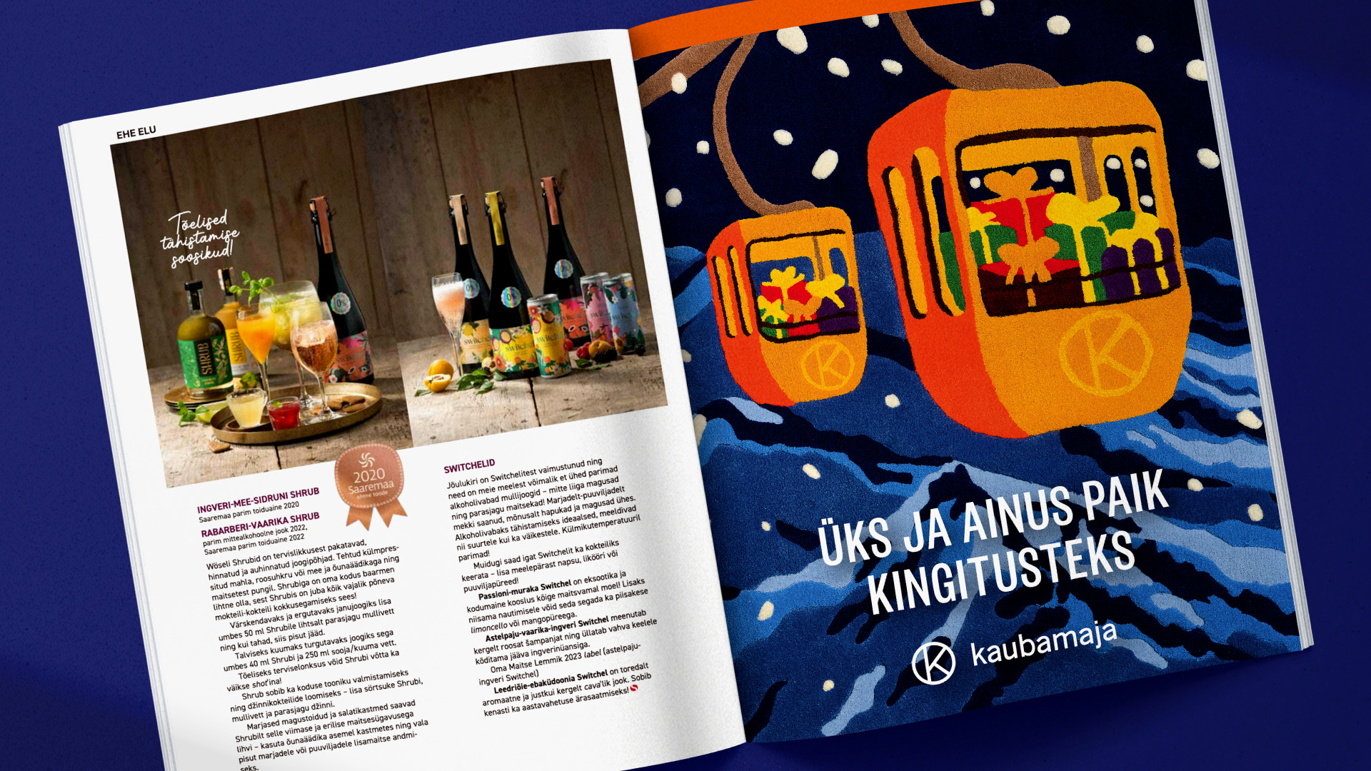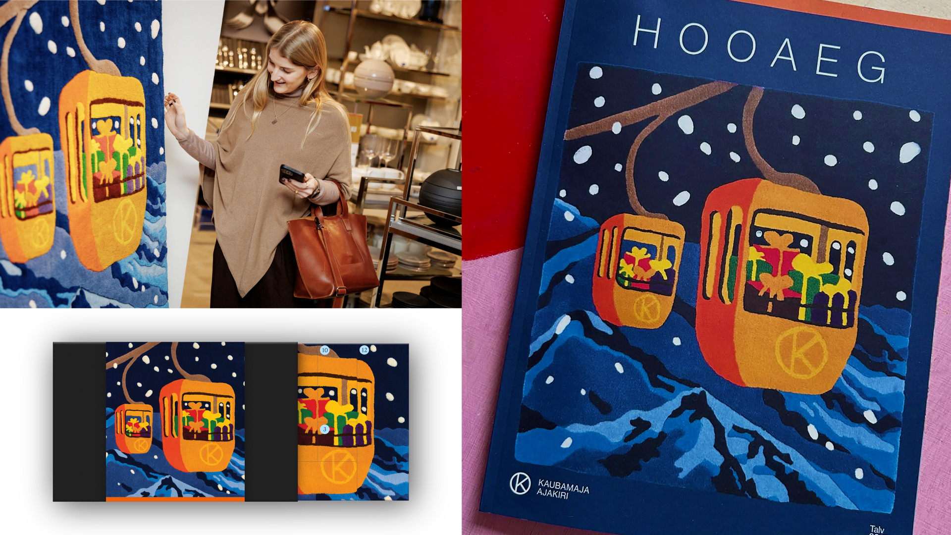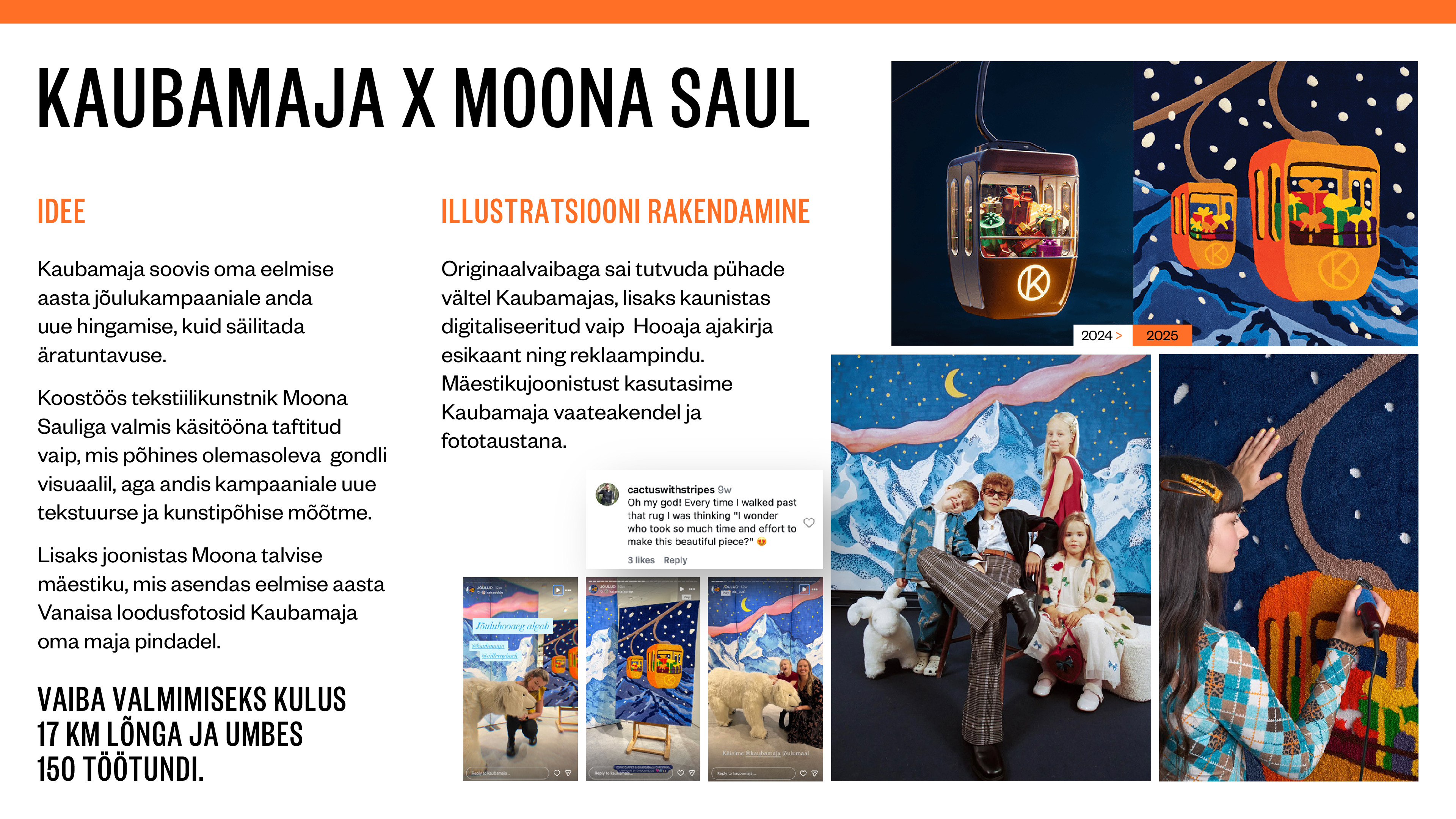 Lõime koostöös tekstiilikunstnik Moona Sauliga Kaubamajale jõuluks käsitööna taftitud vaiba ja talvise mäestikujoonistuse, mida kasutasime läbivalt nii poes sees kui ka reklaammaterjalidel. Lisaks silmailule, toetas lähenemine Kaubamaja brändi maailmavaadet, mis hindab kiirmoest kõrgemalt unikaalsust, kvaliteeti ja meisterlikkust.