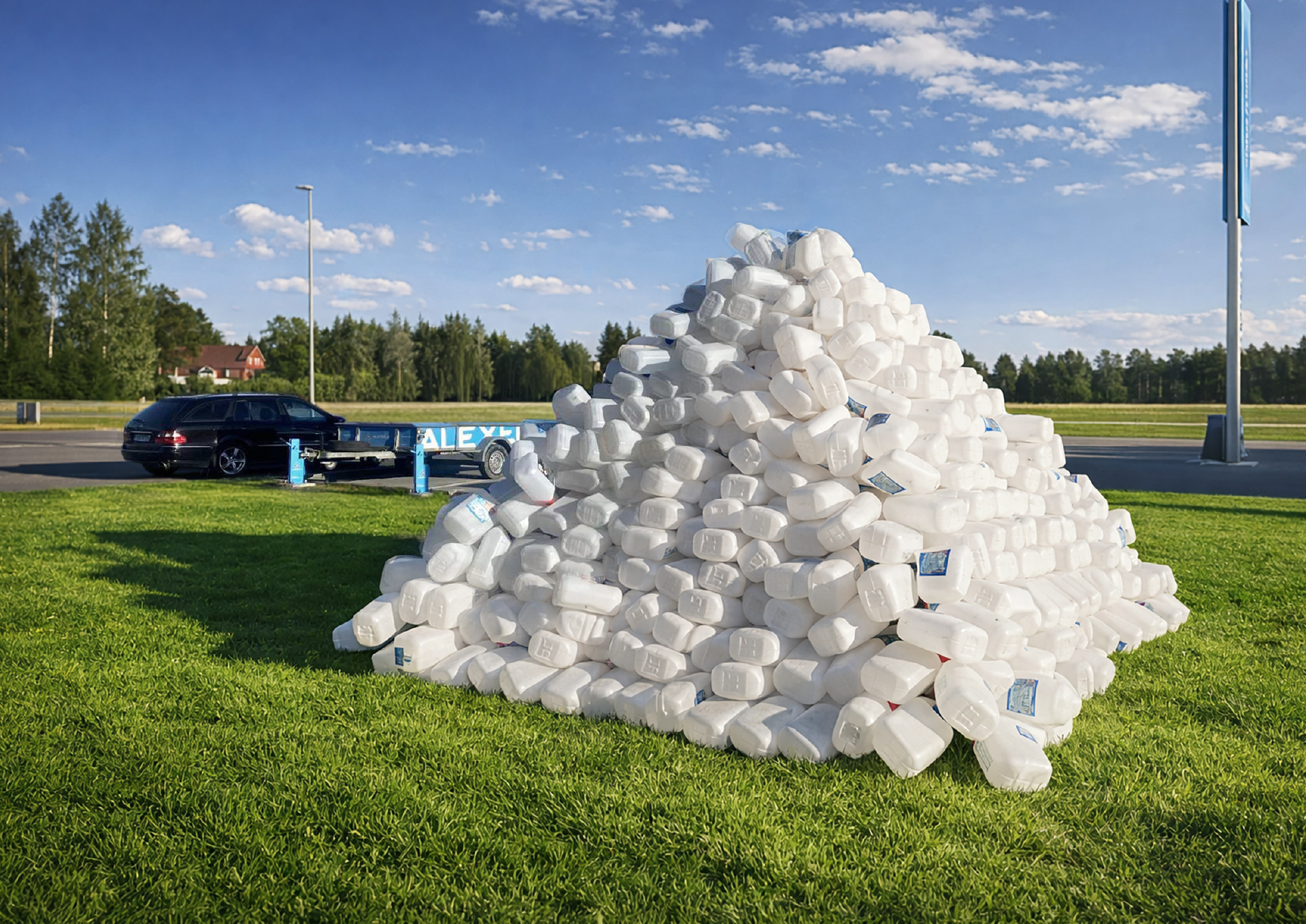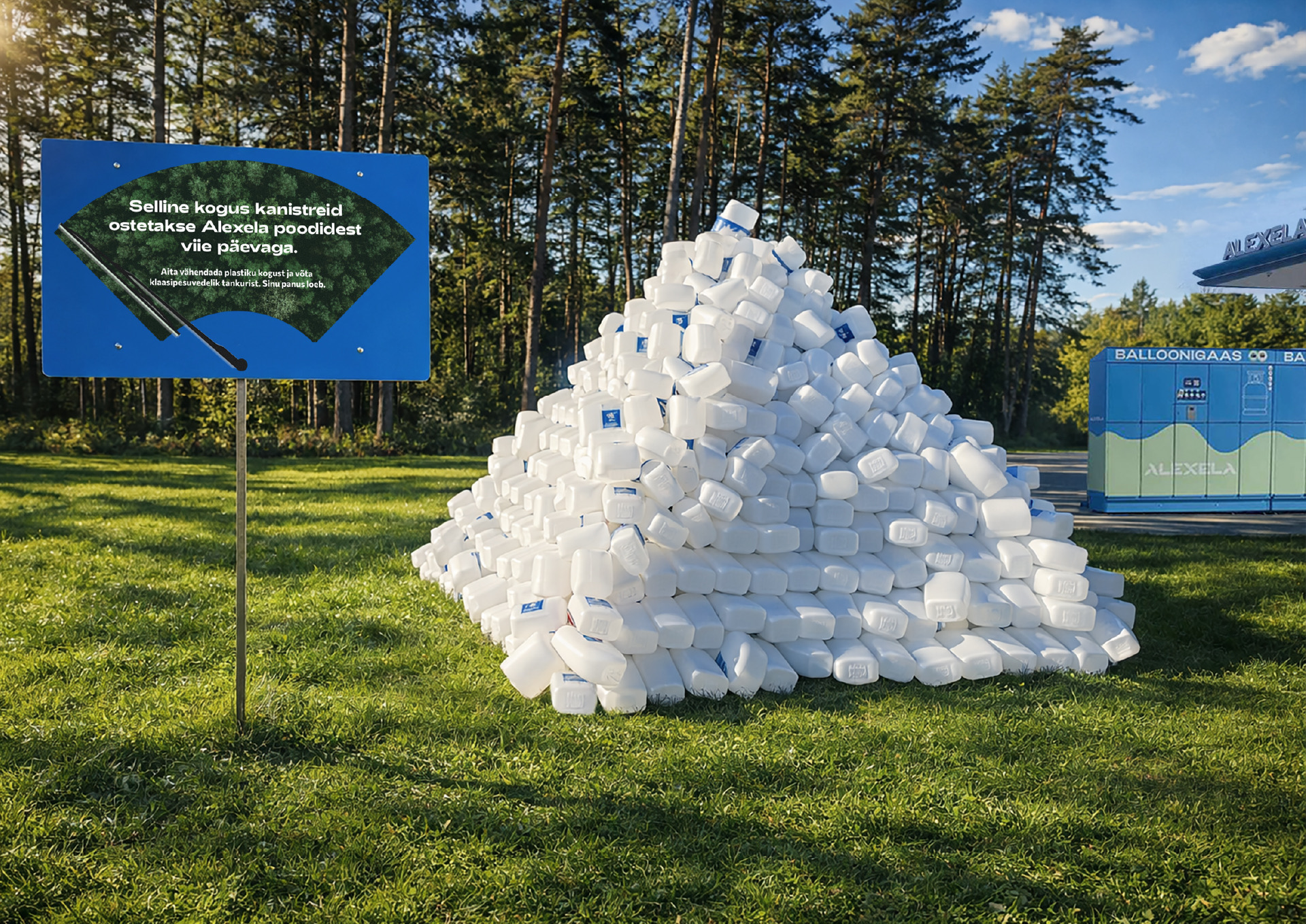 Umbes iga viie päeva tagant ostetakse püramiidisuurune kuhjatäis kanistreid aknapesuvedelikuga. Alexelas saab aga klaasipesuvedelikku ka tankurist. Et seda infot inimestele lihtsal ja illustreerival moel kommunikeerida, ehitasime Alexelasse päriselt sama suure kanistri-prügimäe, mis suunas inimesi ostma klaasipesuvedelikku tankurist.