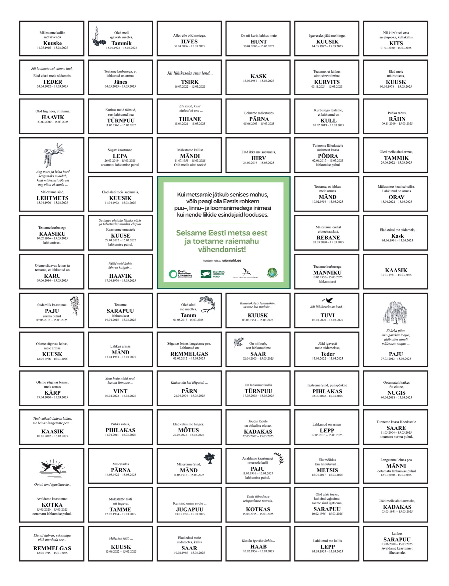 Kasutasime printreklaamis ja hauakividel reklaamiteksti leinakuulutuse keeles. Kuulutused mälestasid puude ja metsaelanike elusid, jäädes teadlikult napiks nagu päris mälestuslaused.