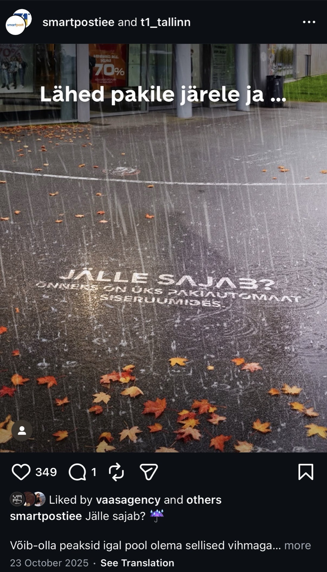 Eestis sajab kolmandiku aastast, kuid pakiautomaadi valik tehakse e-poes sekunditega ja enamasti hinna järgi. Tõime SmartPosti siseruumides asuvate pakiautomaatide eelise nähtavale täpselt siis, kui probleem tekkis – vihmaga. Hüdrofoobne sõnum ilmus asfaldile väliautomaatide juures, suunates tähelepanu ainsale kuivale lahendusele.
