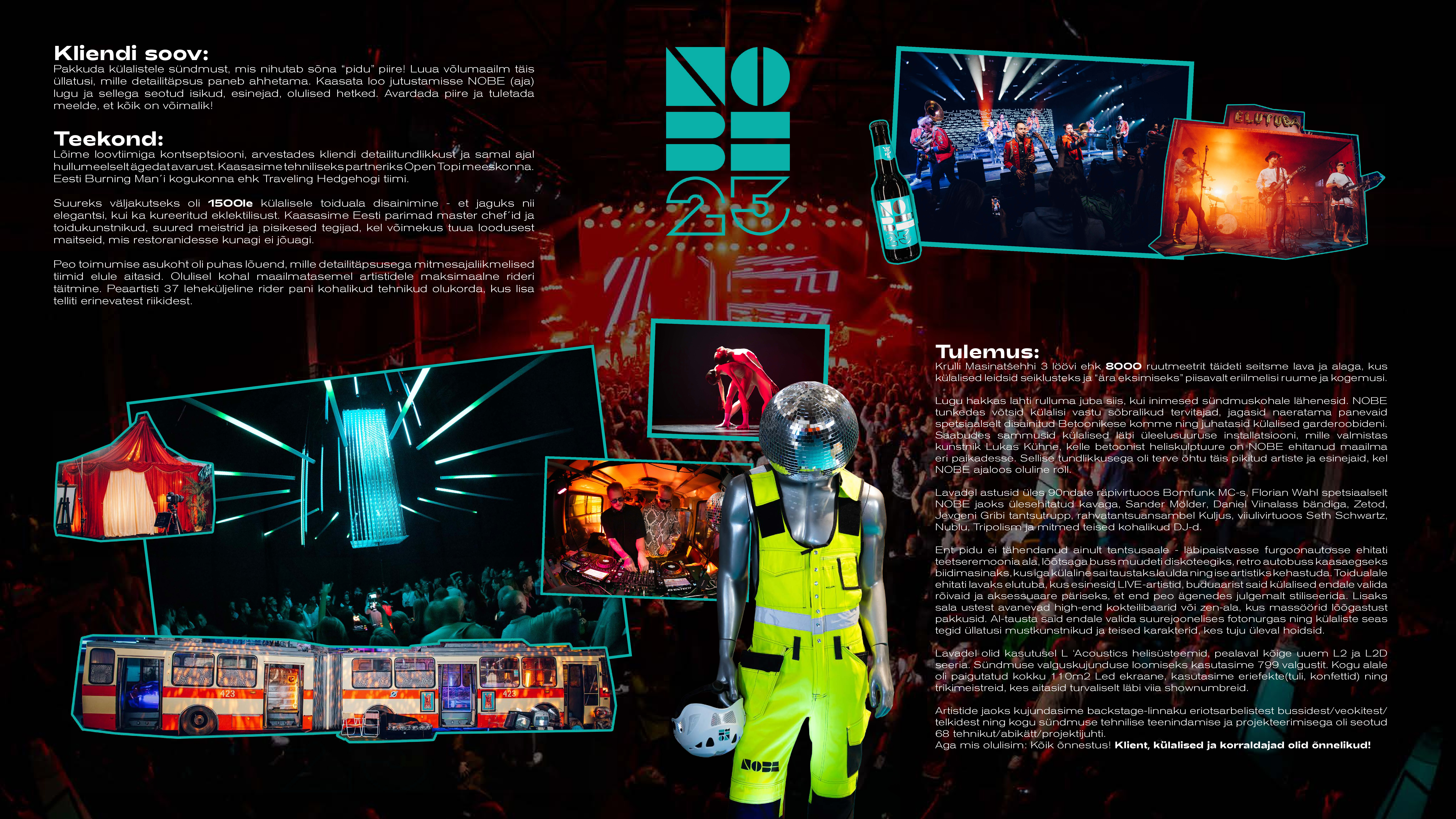 Ehitasime mängumaa täiskasvanutele, kus sõna “pidu” sai avarduda. NOBE sünnipäevapidu nihutas piire nii külaliste kui tegijate jaoks. 8000 ruutmeetrit transformeerus üheks õhtuks unustamatuks kogemuseks, mis tuletas meelde: kõik on võimalik!