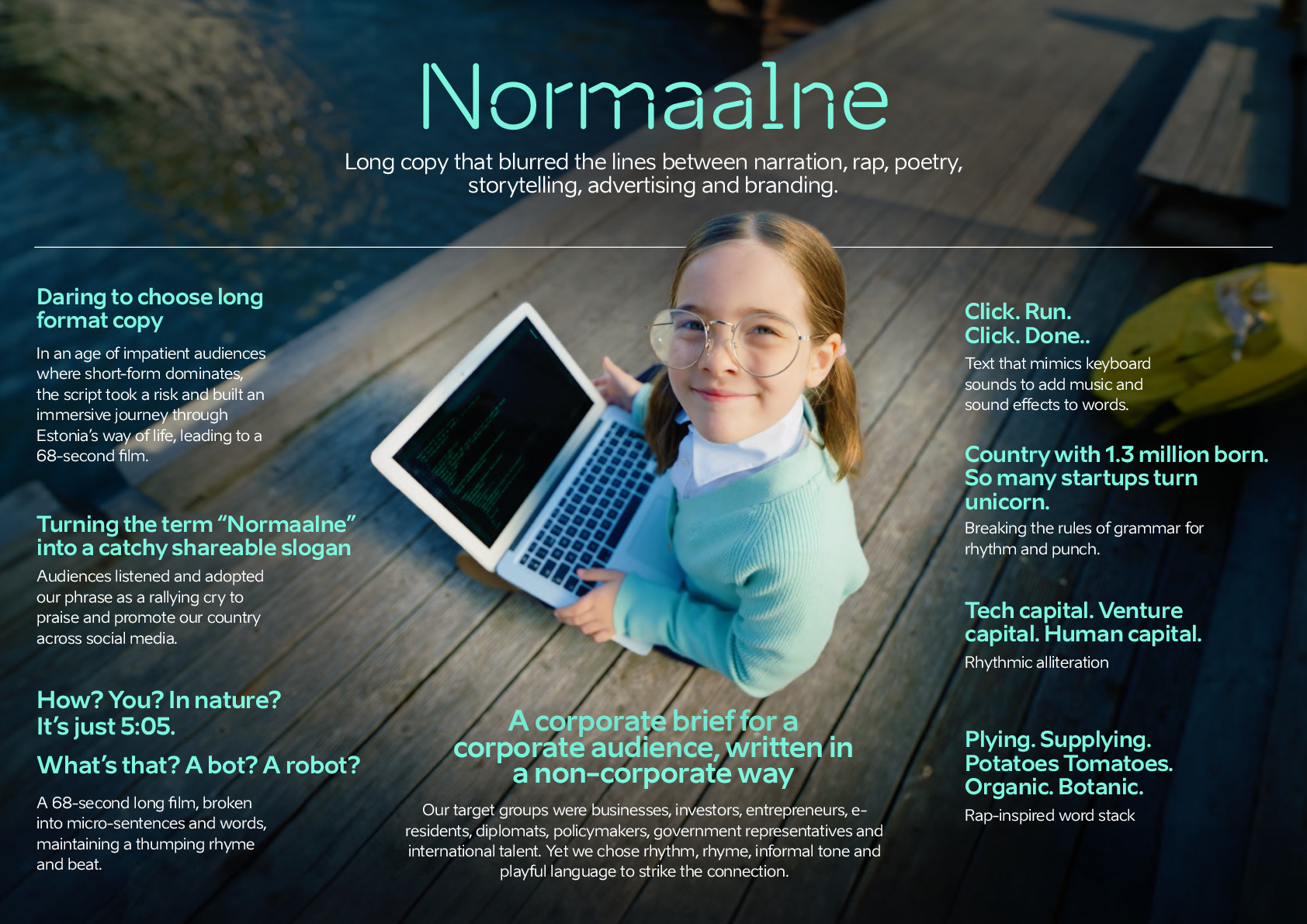 Kõige ettevõttekesksema B2B kanali ehk LinkedIni jaoks loodud reklaamfilmis on teadlikult välditud korporatiivset lähenemist. Pikas formaadis 68-sekundilises muusikaklipis on kasutatud hiphopi stiilis jutustust ja mängulist riimi, et tutvustada vaatajatele Eesti elu kuut tahku. Klipp võeti hästi vastu ja see ajendas inimesi LinkedInis Eestist rääkides kasutama sõna „normaalne”.