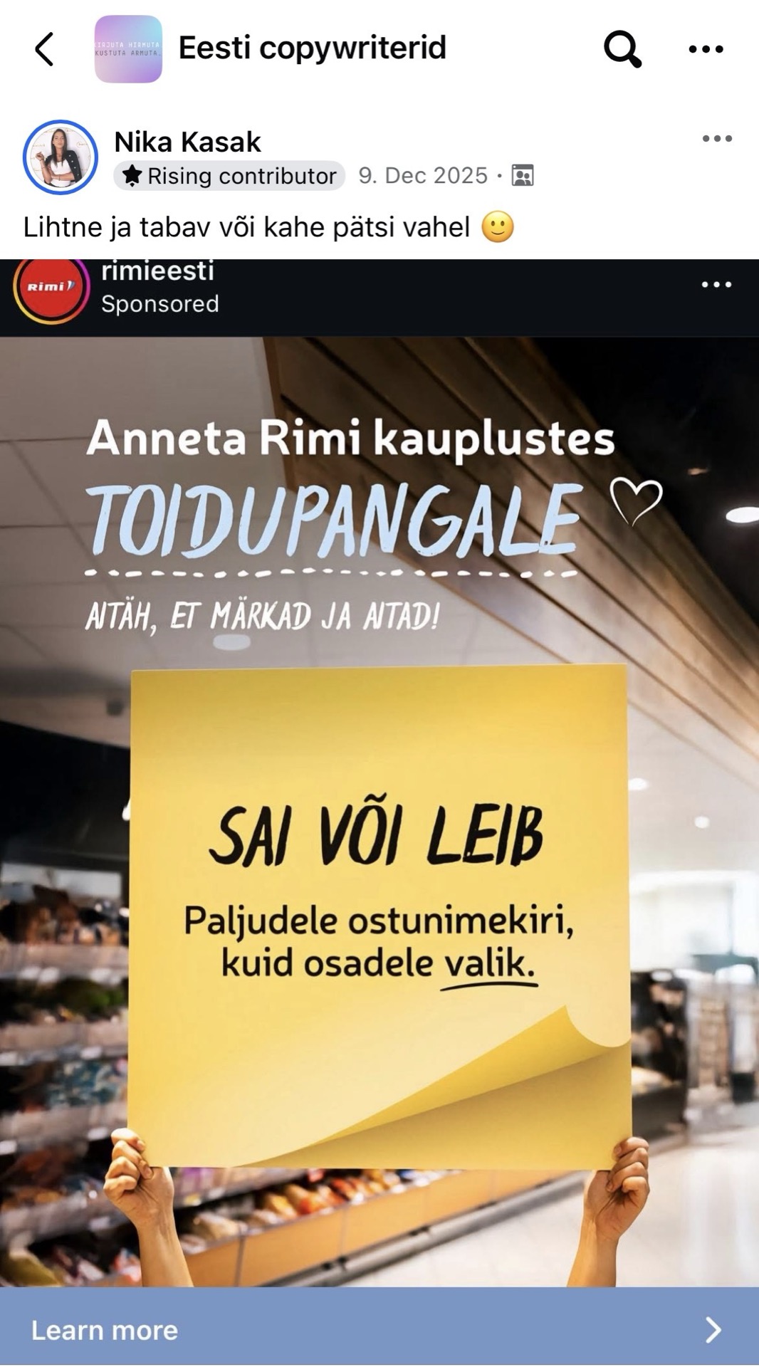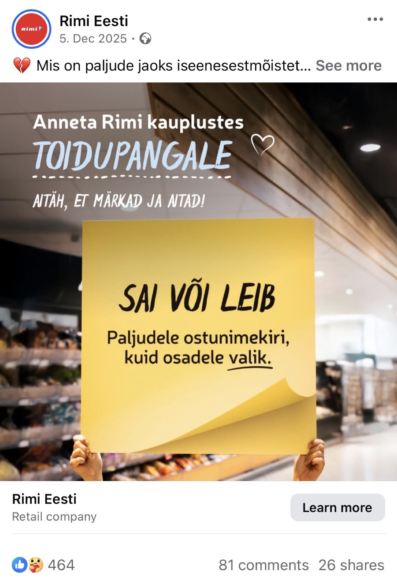 Kõigil on praegu raske, sellegipoolest on majanduslik seis ühtede jaoks keerulisem kui teiste. See, mis paljude jaoks tähendab tavapärast ostunimekirja, võib tähendada osade jaoks hoopis valikut. Lisasime saia ja leiva vahele ühe hästi paigutatud “või” – “Sai või leib” – ja alateksti “Paljudele ostunimekiri, kuid osadele valik.”, moodustades sellega terviku.