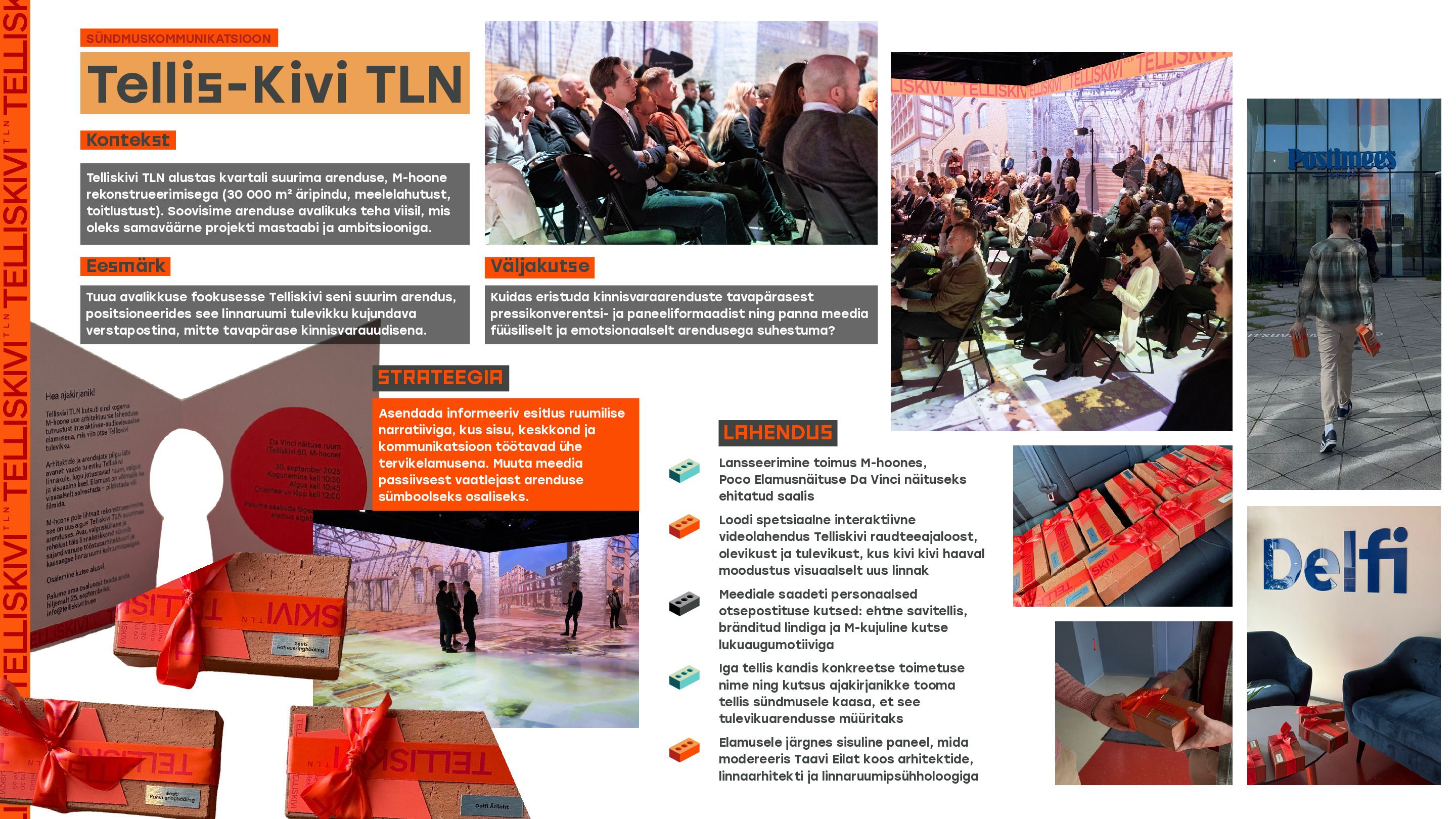 Telliskivi TLNi ärilinnakus asuva M-hoone suurarenduse lansseerimisürituse pressikutseteks oli personaalse otsereklaam. Iga toimetus sai ehtsa telliskivi, koos toimetuse nime graveeringuga, M-tähe kujuline trükisega. Otseposti fookus oli, et iga tagasitoodud telliskivi müüritakse märkidena M-hoone seintesse. Otsereklaam muutis adressaadid sümboolselt arenduse osaks.