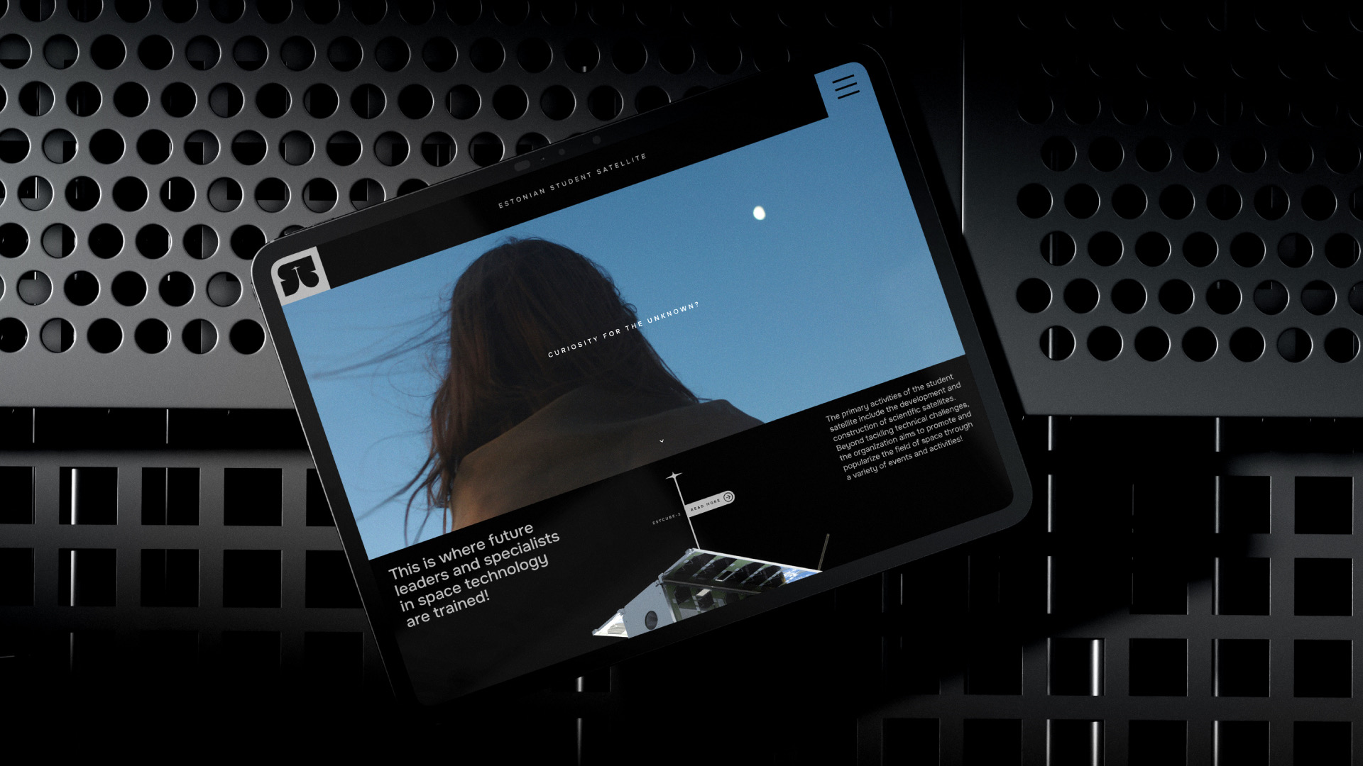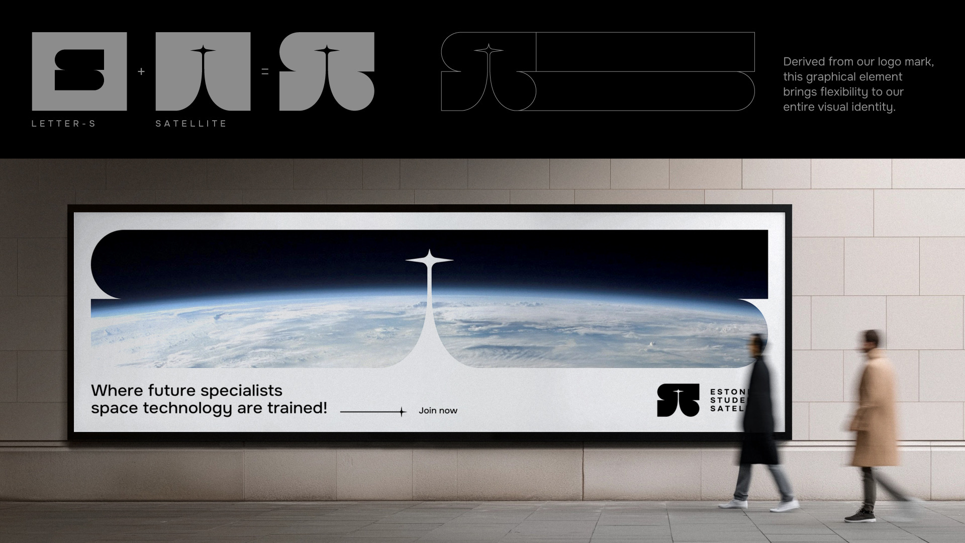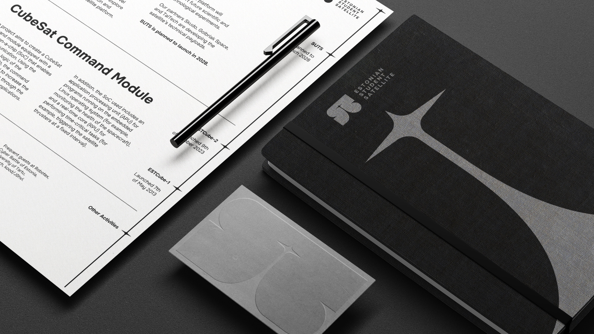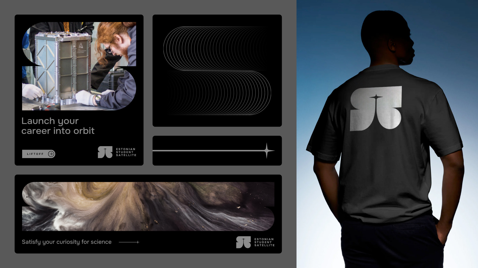 Eesti Tudengisatelliidi Sihtasutuse visuaalne identiteet lähtub logomärgist, mis toimib dünaamilise elemendina ning loob paindliku aluse eri formaatide ja visuaalide loomiseks. Logomärk ühendab endas S-tähe, startiva satelliidi ja selle peegelduse kosmoses. Bränding on minimalistlik ja puhas, peegeldades valdkonna professionaalsust ning ammutades inspiratsiooni kosmosetehnoloogiast.