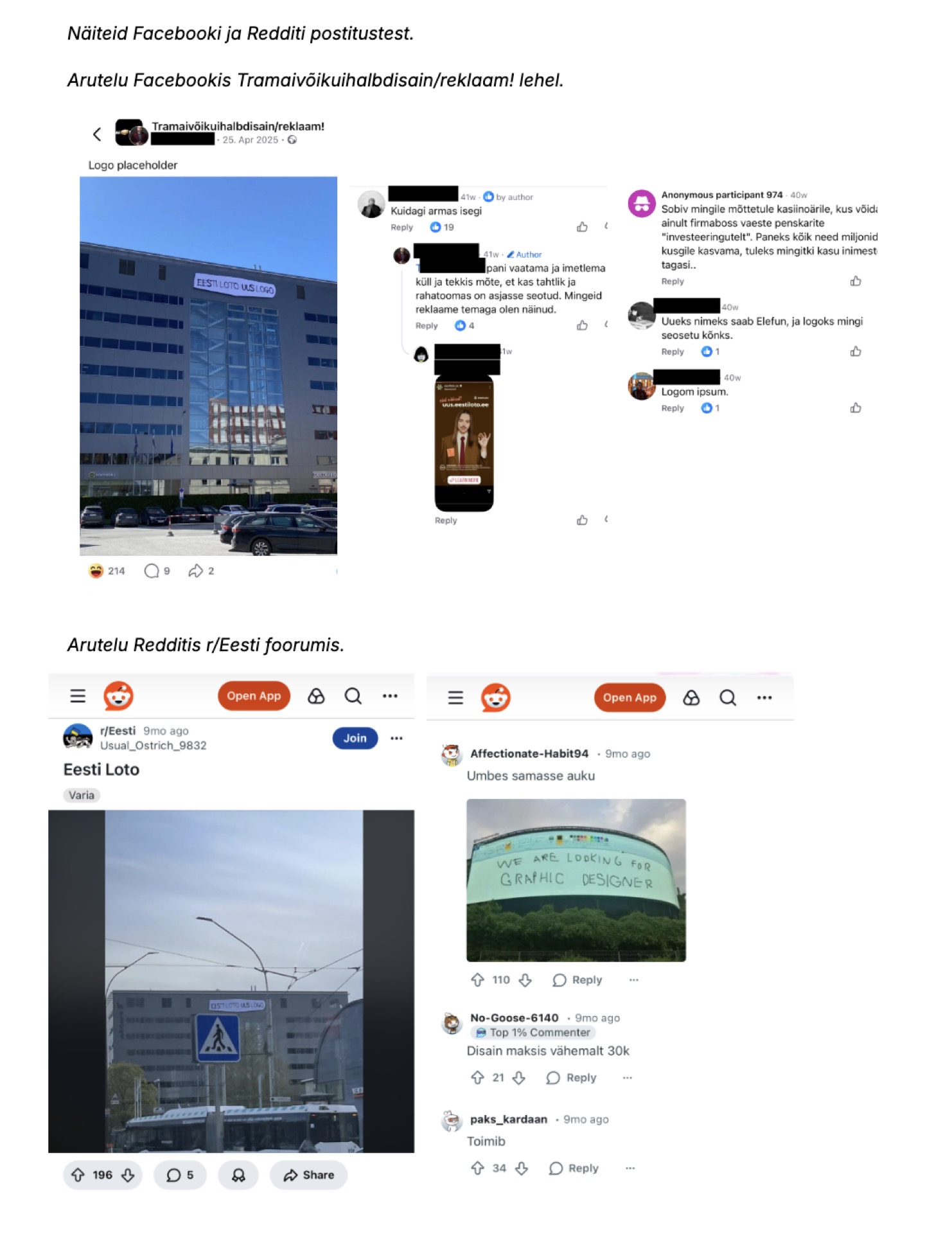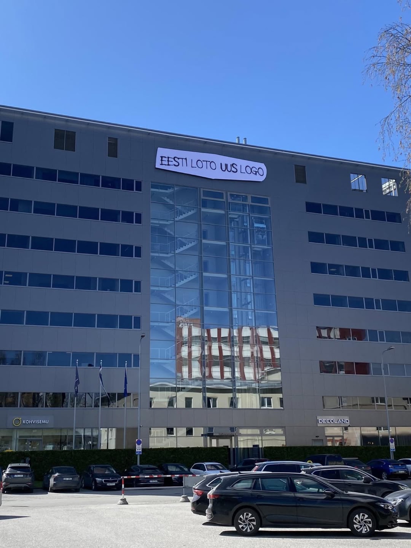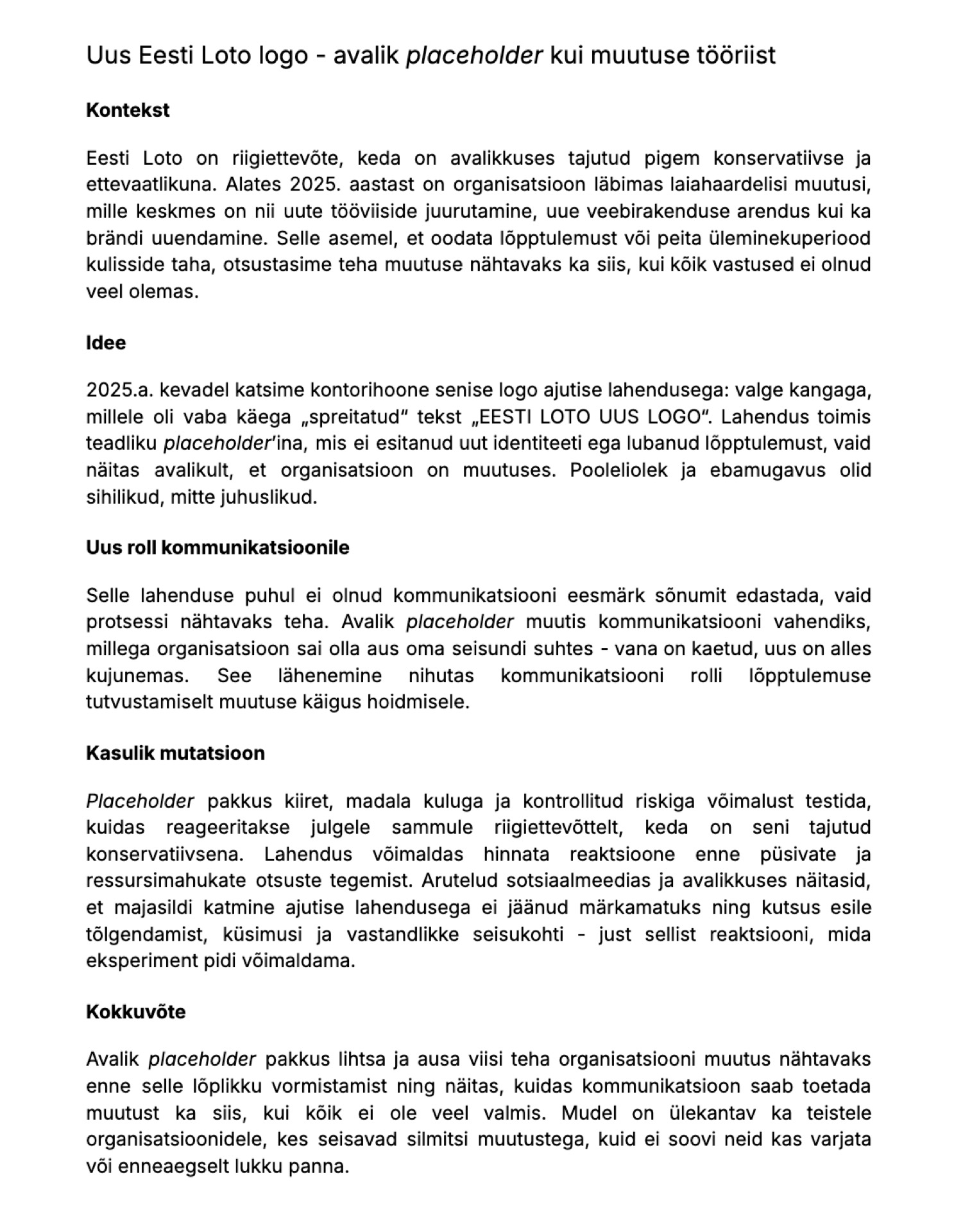Eesti Loto kontorihoone senine logo kaeti valge kangaga, millele oli vaba käega „spreitatud“ tekst „EESTI LOTO UUS LOGO“. Teadlikult ebamugav lahendus tegi organisatsiooni muutuse avalikuks enne uue logo valmimist. Avalik placeholder võimaldas kiirelt, madala kuluga ja kontrollitud riskiga testida reaktsioone julgele sammule riigiettevõttelt, keda on seni tajutud konservatiivsena.