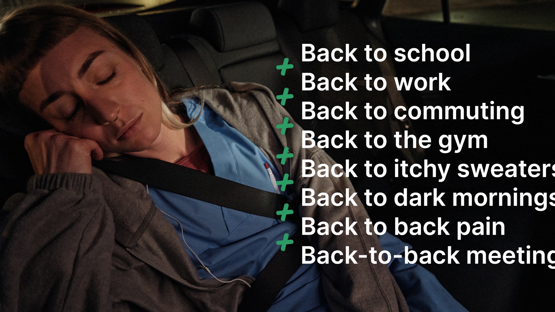 Tagasi kooli, tööle ja ummikutesse. Tagasi trenni, karedate kampsunite, pimedate hommikute ja silmaaluste kottide juurde. Tagasi seljavalu ja lõputute koosolekute rüppe. Suve lõppedes hakkasid inimeste kohustused taas kuhjuma. Meie sõnum neile oli lihtne: kui elu lisab pingeid, võta Bolt Plus, mis lisab su argipäeva hüvesid.