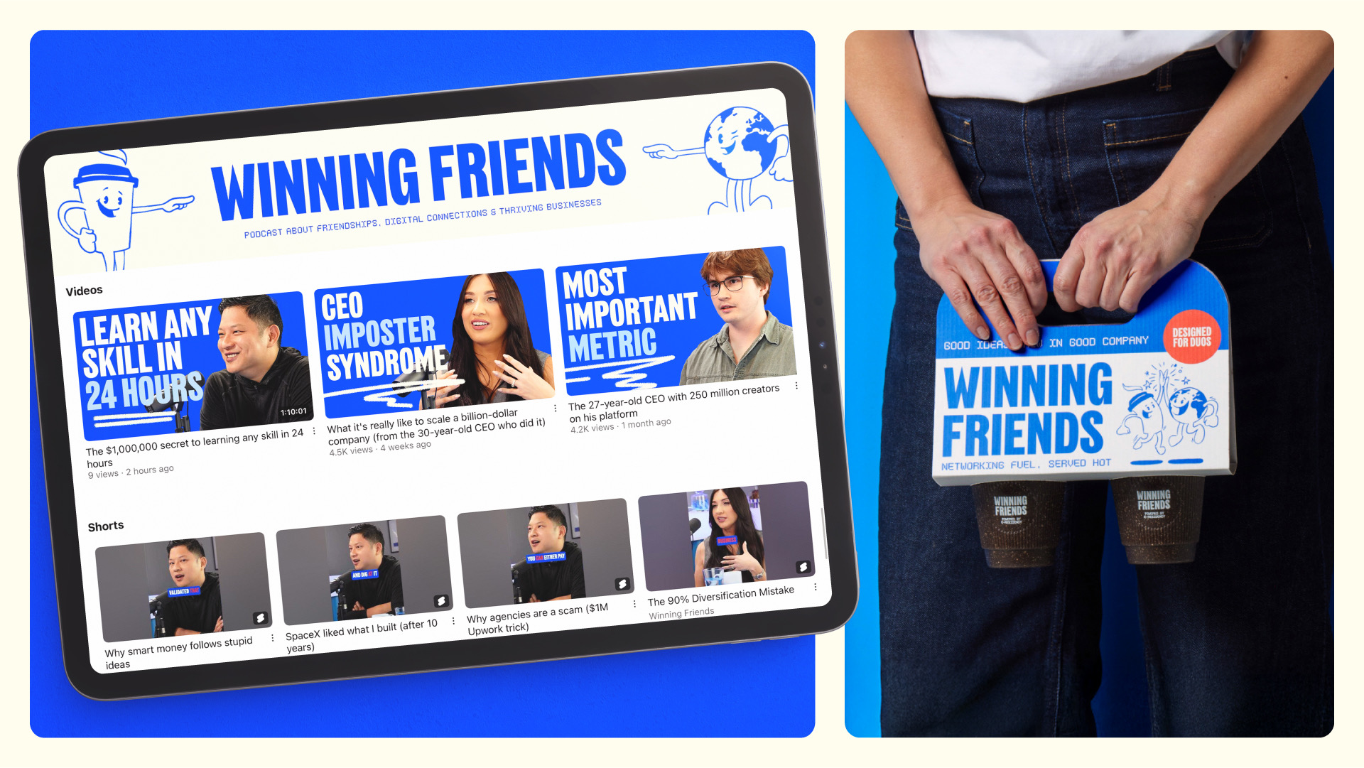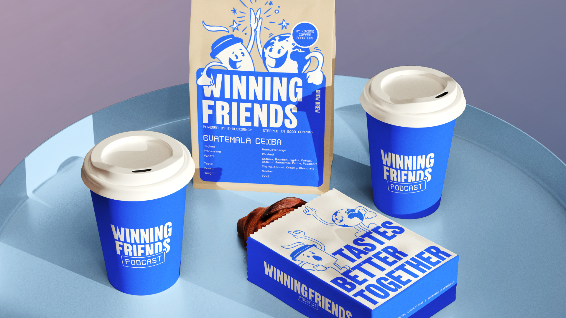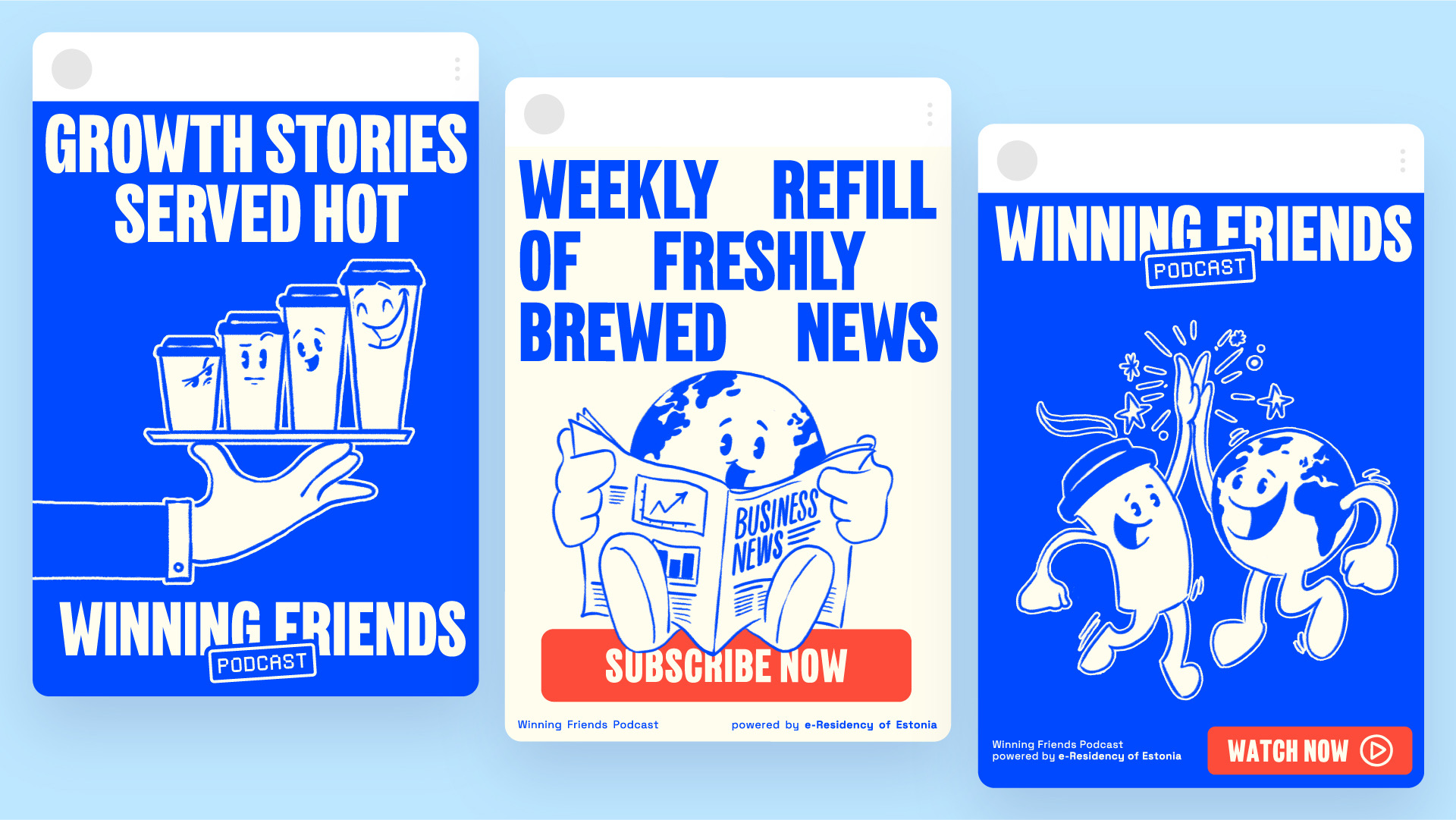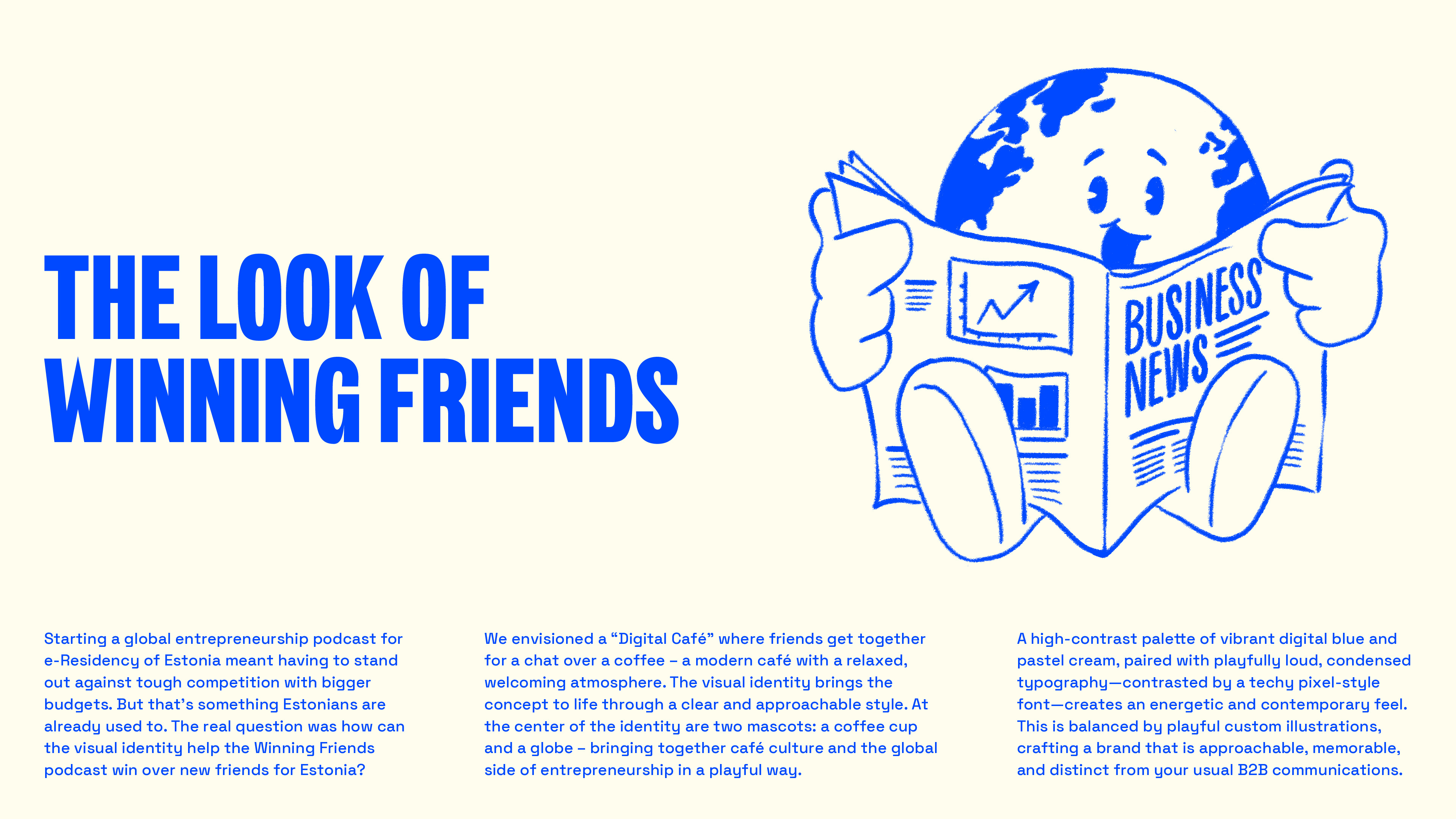 How to help e-Residency's podcast win new friends for Estonia? We built Winning Friends around a cozy digital café vibe - a place where thought leaders from across the globe can relax and share ideas. Bright colors, playful type, and coffee-cup and globe mascots - a balance in crafting a brand that is approachable, memorable, and distinct from typical B2B communications.