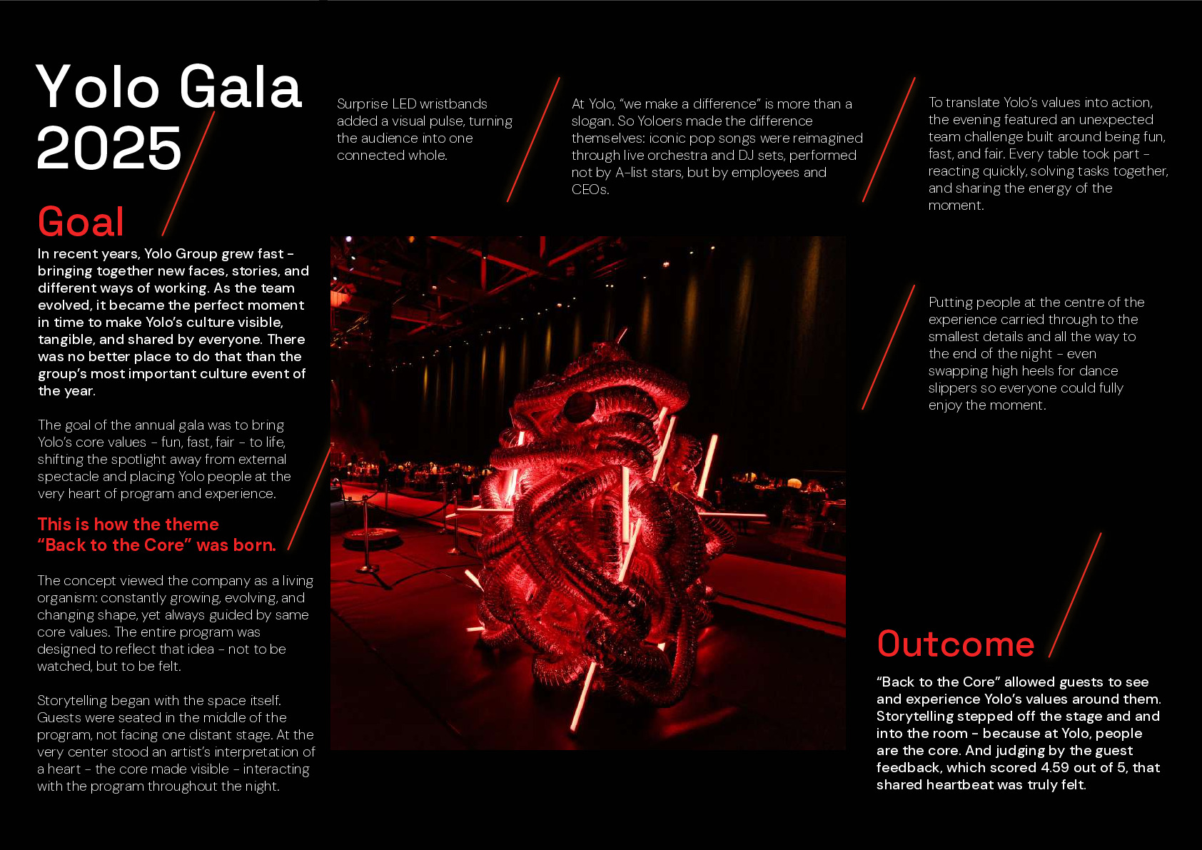 Yolo Groupi kiire kasv tõi kokku palju uusi inimesi ja erinevaid tööviise. Ettevõtte kultuuri nähtavaks ja ühiselt kogetavaks tegemine muutus eriti oluliseks. Yolo iga-aastasel tunnustusgalal tõusid keskmesse tuumväärtused fun, fast ja fair, nihutades fookuse lavalisest vaatemängust inimeste ja nende ühise kogemuse peale.