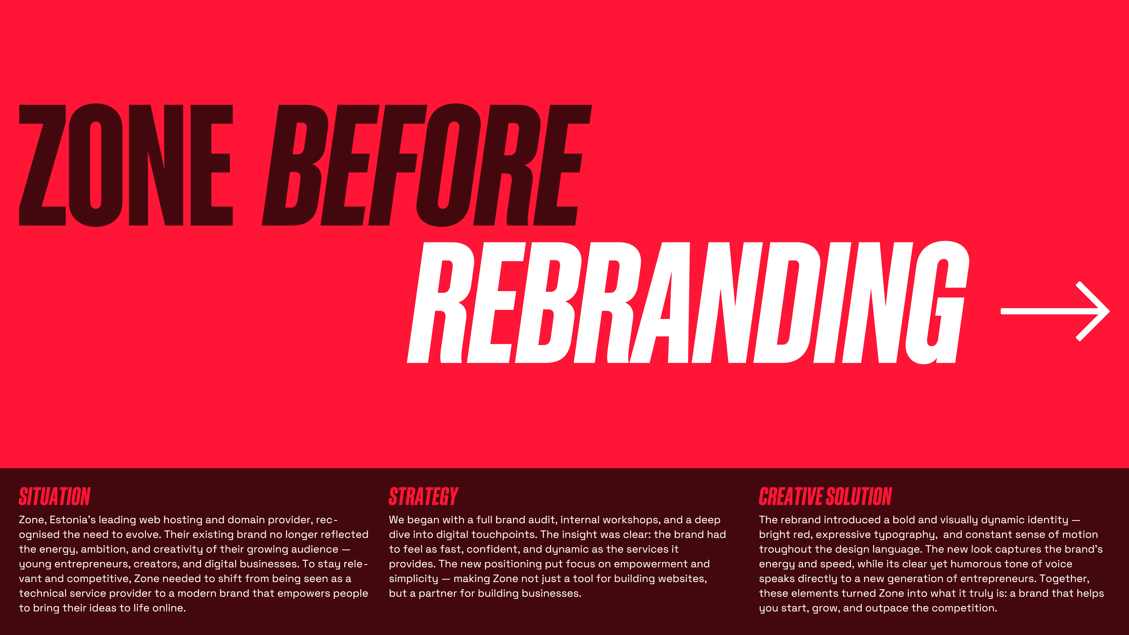 Zone on Eesti suurim veebimajutusteenuse pakkuja, kuid tema visuaalne keel oli ajale jalgu jäänud. Bränd mõjus vanamoelisena ega peegeldanud Zone tugevusi: kiirust, jõudlust ja paindlikku kliendituge. Rebrändingu eesmärk oli muuta Zone visuaalselt sama enesekindlaks ja professionaalseks kui teenus ise. Uus identiteet on jõuline, dünaamiline, kaasaegne ja usaldusväärne.